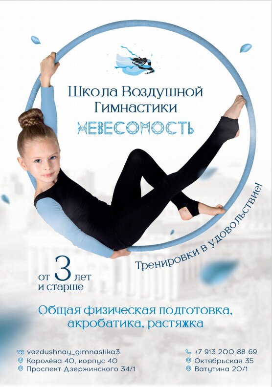 Я занимаюсь воздушной гимнастикой уже 7 лет и могу сказать что воздушная гимнастика — это вид спорта, сочетающий акробатику и танцы Занятия проходят на полотнах, кольцах и тд , развивая гибкость, силу и координацию. Этот спорт помогает укрепляет тело и способствует самовыражению.